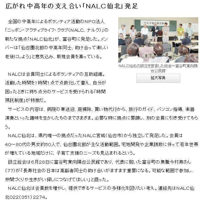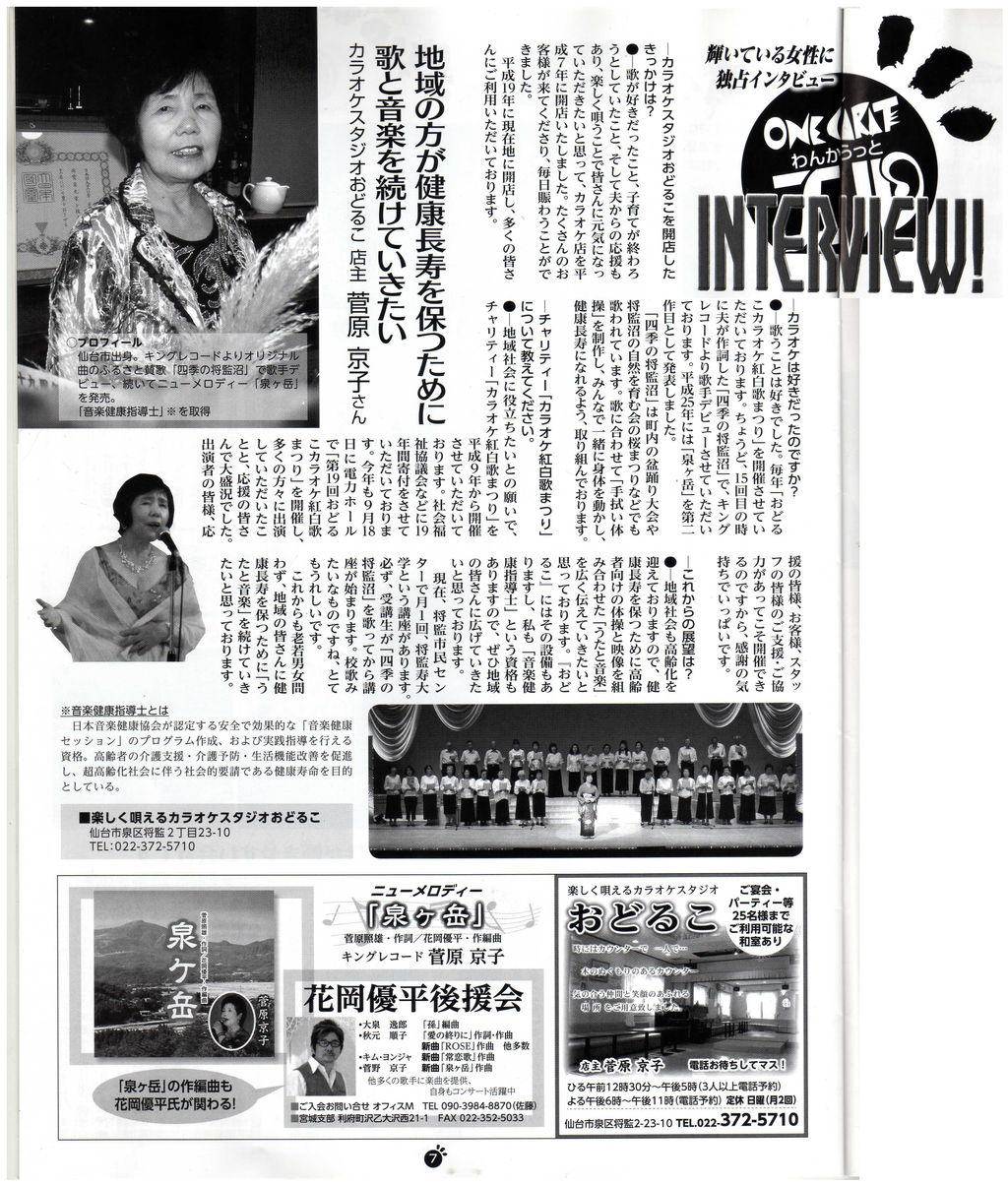 ナルク仙北の有力メンバーで将監のカラオケスタジオ「おどるこ」のオーナーである 菅原京子様 が女性起業家を応援する新聞マガジン「わんからっとエル」の20周年記念号に取材、掲載されました。特集「女性が活躍する会社」紹介記事や写真にはナルク仙北の会員が5~6名が写っています。ナルク仙北発足当時から会員増強に力強くバックアップして頂いて居ます。