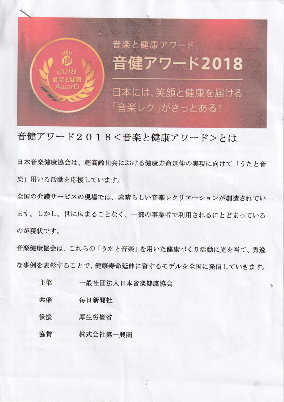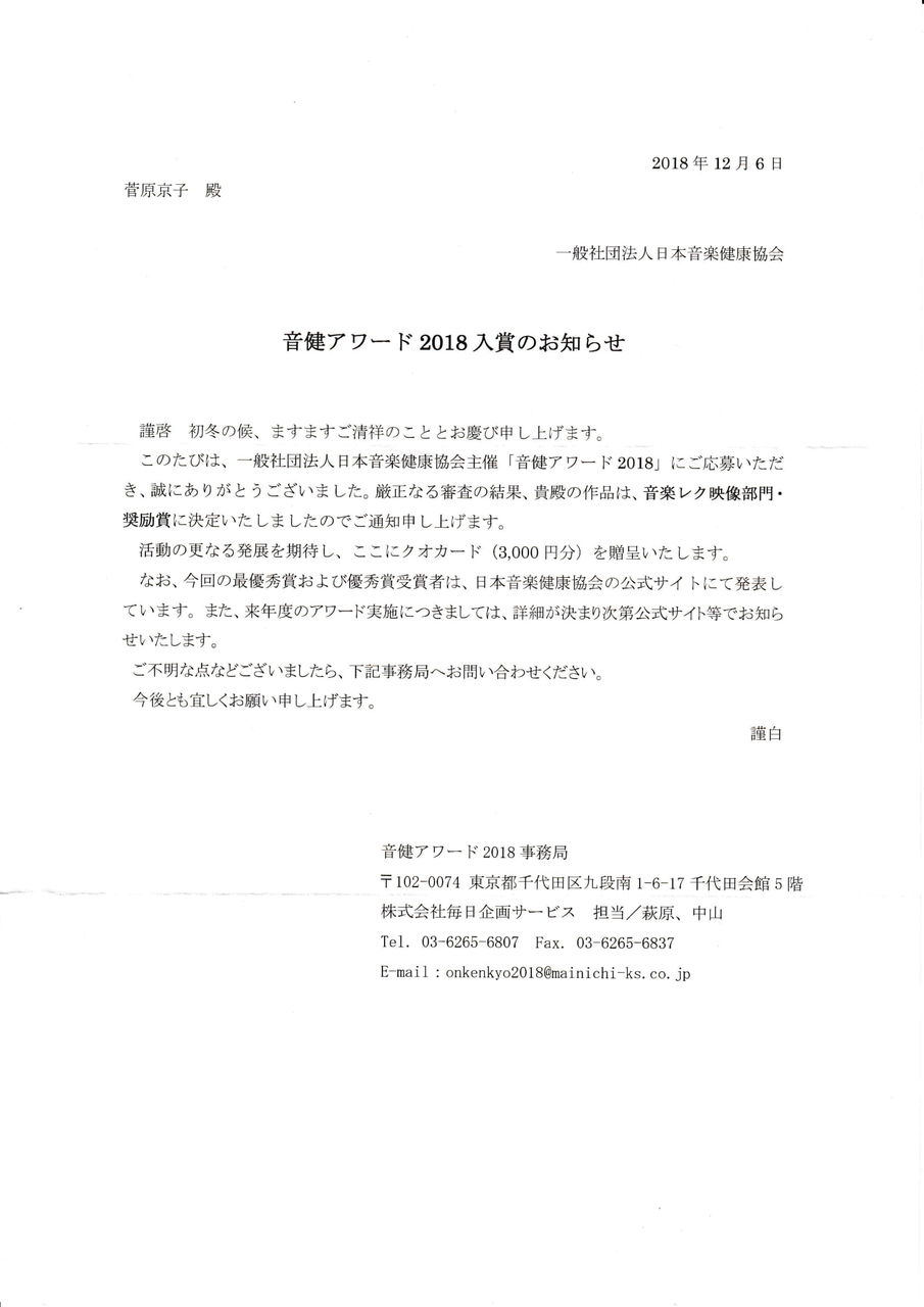『社団法人 日本音楽健康協会』より奨励賞を受賞されました。